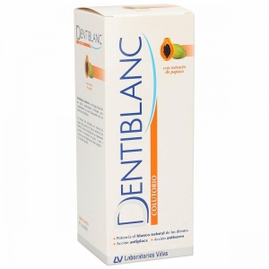 Dentiblanc colutorio es un tratamiento que actúa complementando la acción blanqueadora de Dentiblanc pasta dental, refrescando, protegiendo y blanqueando tus dientes. La acción de sus ingredientes, entre los que se encuentra la papaína, previene la formación de placa, sarro y el mal aliento, favoreciendo a tu higiene bucal. Es un colutorio que proporciona un efecto protector de dientes y encías además de una acción desensibilizante.