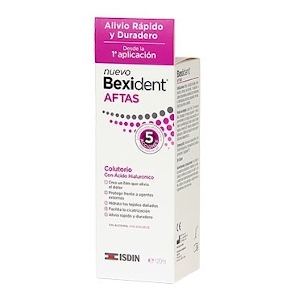 El colutorio bucal protector de Bexident® Aftas es un enjuague bucal que ayuda a calmar el dolor ocasionado por roces, llagas o heridas producidas a causa de llevar ortodoncias o prótesis dentales. Elaborado con ácido hialurónico y la tecnología Advanced Hyaluronfilm Tech, que crea un film protector, alivia el dolor de las heridas y facilita la cicatrización de forma rápida y segura. Calma las molestias de la mucosa oral mediante 5 acciones: Crea un film que alivia el dolor, protege frente a agentes externos, hidrata los tejidos dañados, facilita el proceso natural de cicatrización, aporta un alivio rápido y duradero del dolor desde la primera aplicación. Apto para niños y adultos.