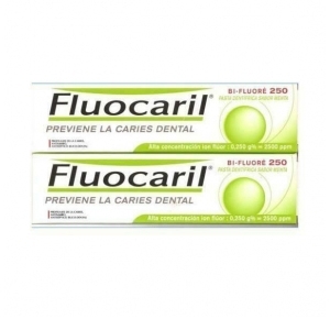 Fluocaril® Bi-Fluoré 250 pasta dentífrica 2x125ml es un tratamiento completo que te ofrece una doble acción anticaries. Su fórmula presenta una alta concentración de flúor (0,25%) lo que implica una amplia protección del diente contra las caries y la placa como también un gran fortalecedor del esmalte dental. Esta pasta dental posee una acción prolongada, que ofrece protección tras su uso durante el cepillado. Indicado para niños mayores de 12 años y adultos. Ofrece una doble acción anticaries: Acción inmediata: el flúor se fija rápida y directamente sobre el esmalte así como sobre la placa dental. Acción persistente: el flúor actúa de forma prolongada, incluso después del cepillado. Ayuda a reforzar el esmalte evitando que los ácidos carcinógenos ataquen y afecten al diente y que las encías se inflamen. Posee también una acción antisarro que facilita la fijación del flúor sobre el esmalte.
