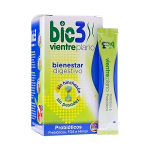 Bio3 Vientre Plano Bienestar Digestivo 24uds es un complemento alimenticio que logra mantener el equilibrio de la flora intestinal en los procesos de adelgazamiento, acabando con el hinchazón y la pesadez. Formulado con una rica mezcla de probióticos, fibras prebióticas y extracto de hinojo, consigue mantener una función fisiológica óptima. Mantiene una función fisiológica óptima en procesos de adelgazamiento y regenera la flora intestinal. Ayuda a combatir molestias como el hinchazón y la pesadez y reduce la probabilidad de sufrir por estreñimiento, aumento de los gases y molestias intestinales. Viene en formato de sticks solubles, fácil de tomar.
