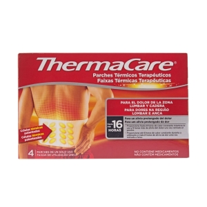 ThermaCare parches térmicos zona lumbar y cadera 4uds son unos parches especialmente diseñados para acabar con las molestias musculares en la espalda y las lumbares. Gracias a su tecnología térmica, ayuda a aliviar el dolor muscular causado por el cansancio y la tensión muscular, los esfuerzos excesivos, los esguinces y las distensiones. Proporcionan un calor terapéutico constante durante aproximadamente 8 horas. Están elaborados con materiales suaves con células térmicas que contienen ingredientes naturales (hierro, carbón, sal y agua), que al contacto con el oxígeno desprenden calor. El calor prolongado y constante aumenta la circulación de la sangre en los tejidos, con lo que ayuda a conseguir un alivio del dolor y la relajación de los músculos.