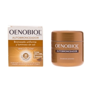 Oenobiol autobronceador 30cáps son unas cápsulas autobronceadoras que ayudan a conseguir un bronceado sin sol de forma uniforme, progresiva y prolongada. Contiene un cóctel de activos naturales: Licopeno, luteína, extracto de cúrcuma, zeaxantina y astaxantina. Los complementos alimenticios se deben utilizar como parte de una dieta equilibrada variada, un estilo de vida saludable y mantenerse fuera del alcance de los niños pequeños.
