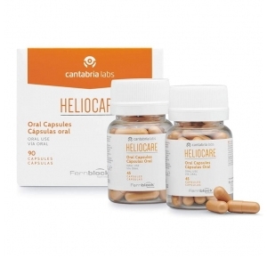 Heliocare Cápsulas Oral 90cáps es un complemento que ayuda a evitar la oxidación de la dermis, ejerciendo una fuerte prevención del envejecimiento cutáneo gracias a este práctico protector de vía oral. Al ingerir las cápsulas antes de la exposición solar, este complemento a base de Fernblock® potencia la protección de la piel de una manera uniforme. Además, posee propiedades antioxidantes y fotoprotectoras, que preservan las defensas cutáneas y la protegen frente a los riesgos de una exposición excesiva a los rayos UVA y UVB. También mantiene la hidratación de la piel, triplica la resistencia de la piel al sol y la fortalece frente a las rojeces y quemaduras. Indicadas en pieles con especial intolerancia al sol, fototipos muy claros, manchas cutáneas, fotoenvejecimiento, pieles sometidas a tratamientos fotosensibilizantes, pieles reactivas y pieles con daño actínico.